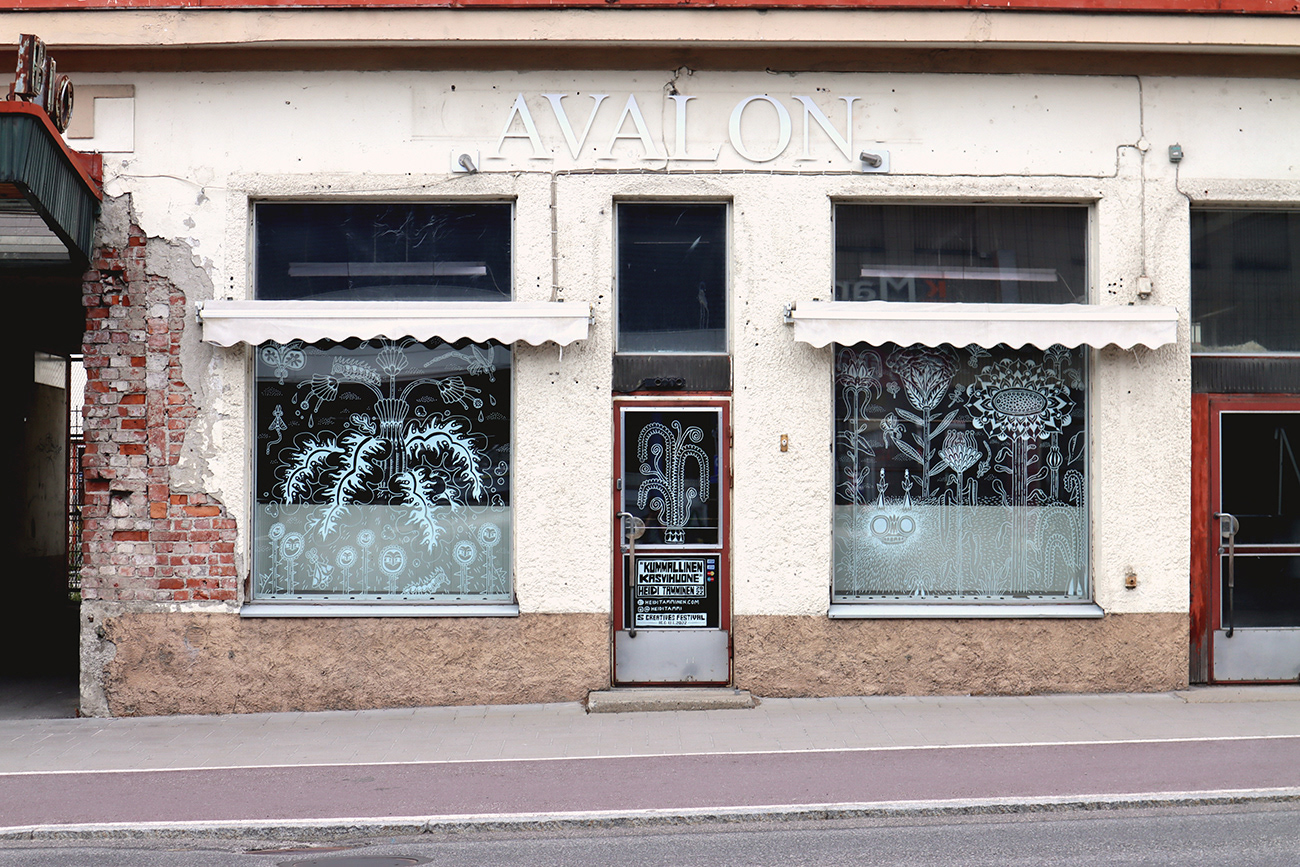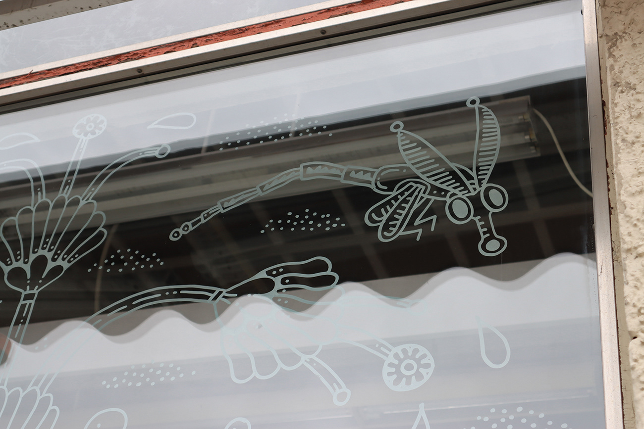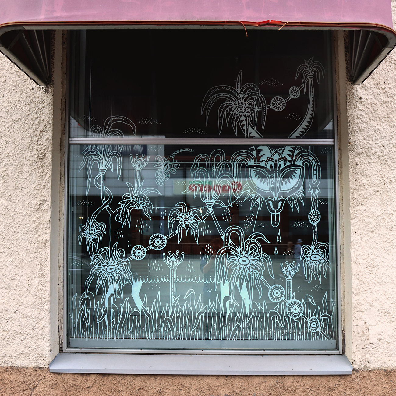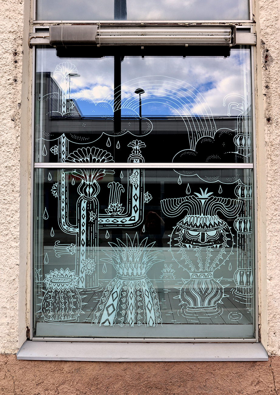 An illustration of a strange indoor garden livening up empty storefront windows in Savonlinna city centre. Created as a live illustration during S creatives Festival 2022.