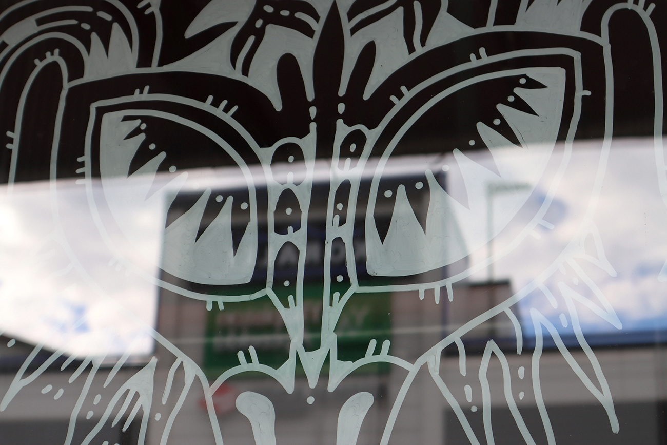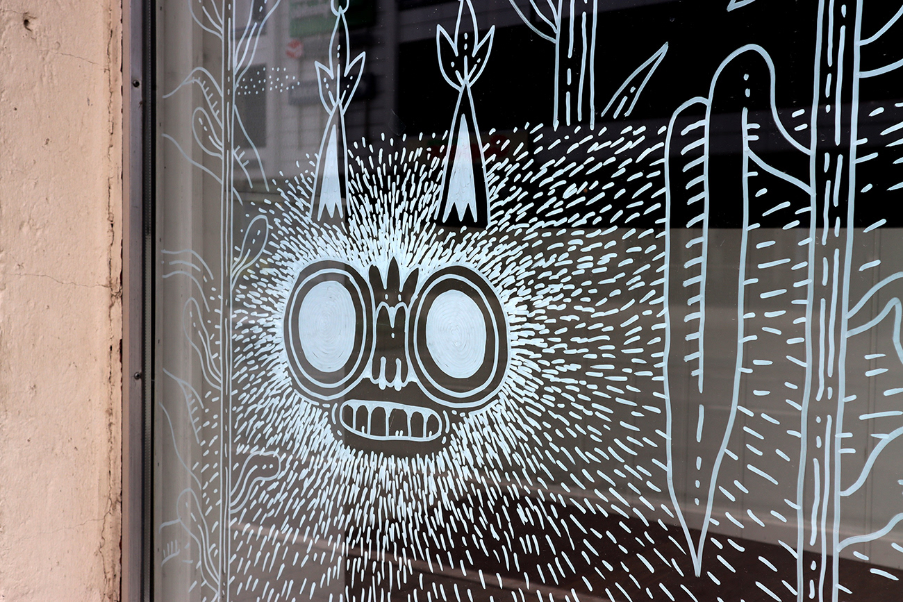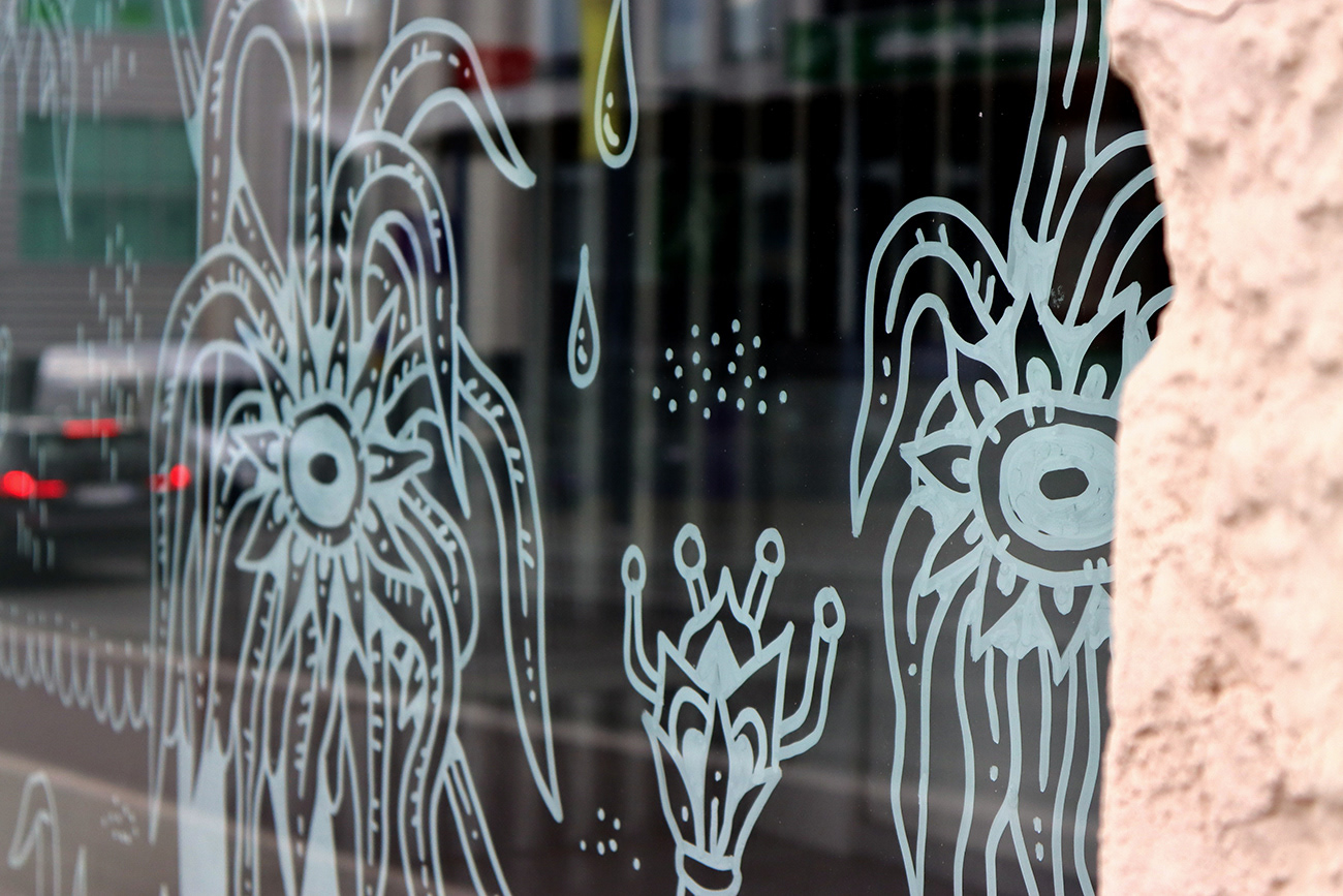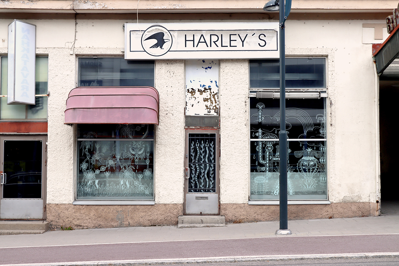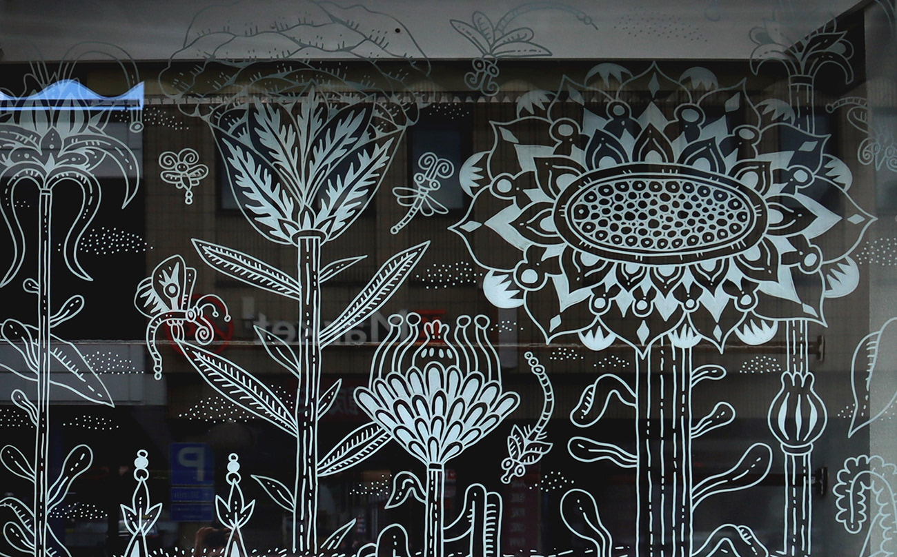 An illustration of a strange indoor garden livening up empty storefront windows in Savonlinna city centre. Created as a live illustration during S creatives Festival 2022.