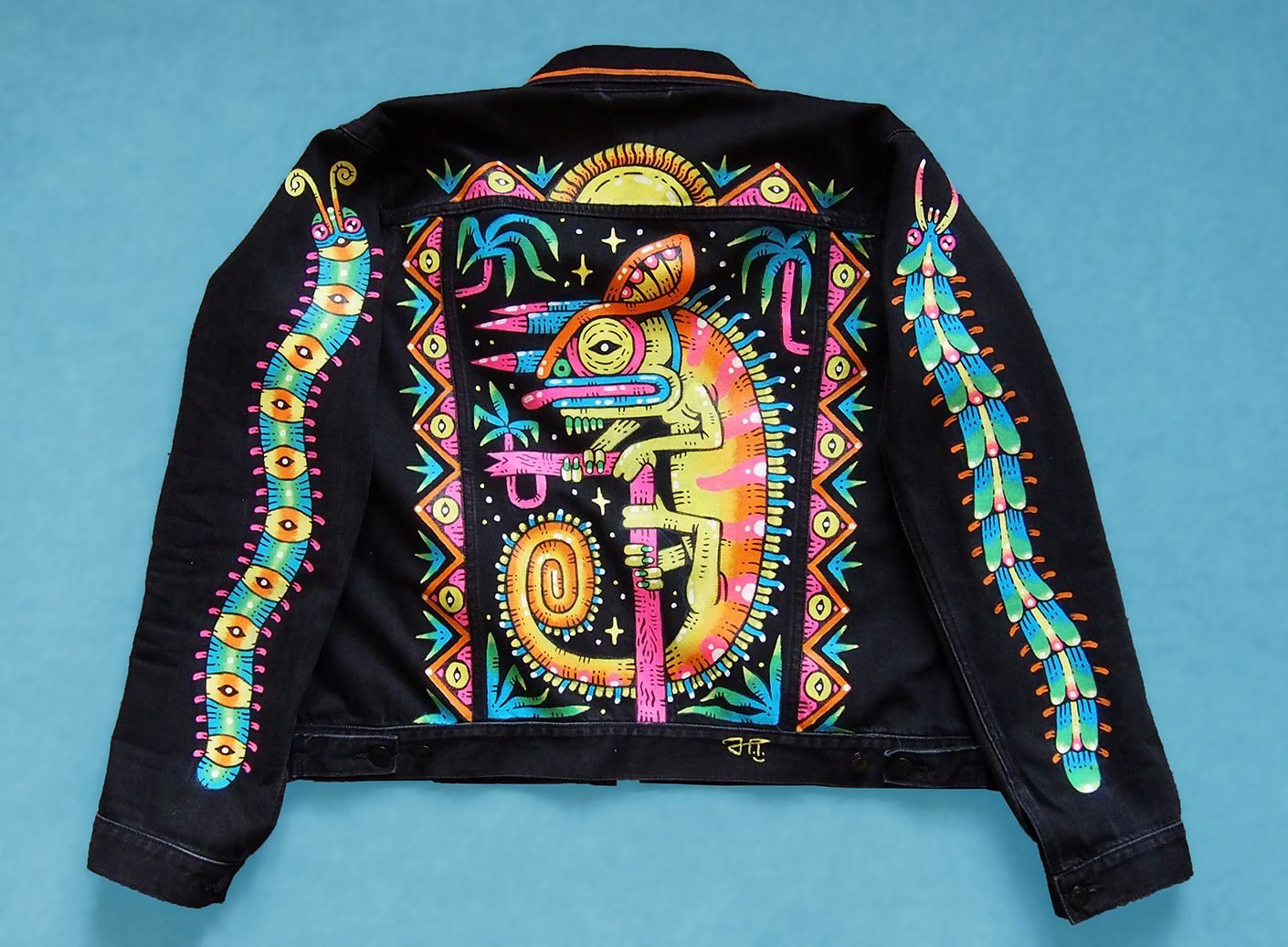A personalised hand-painted denim jacket paying tribute to precious animal friends made at Edinburgh Butterfly and Insect World.